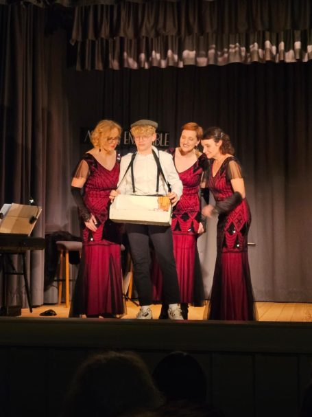 2012 hat mir meine Frau die Klavierbegleitung (die sie selbst einstudieren wollte) für einen zwanziger Jahre Abend geschenkt. Sie sang in einer kleiner Gruppe Gesangsbegeisterter mehrstimmige Stücke und so kam mir die Idee, dass man doch eine kleine Revue entwickeln könnte. Nach einem Vorlauf von einem halben Jahr hat dann eine 12 köpfige Gruppe sich zitternd vors Publikum gestellt, sich freigespielt und viel Applaus bekommen. Die Auftritte waren durchsetzt von starken Soli, Chorgesängen in unterschiedlicher Formation, ausgefeilt vorgetragenen Gedichten, Sketchen und Tänzen. Wir haben z.B. 5 Jahre lang eine Stummfilmszene spielen dürfen, die wunderbar schräg und gleichzeitig lustig war. 2023 habe ich die Gruppe verlassen. Ich hatte dort eine gute Zeit und konzentriere mich nun auf eigene Projekte.