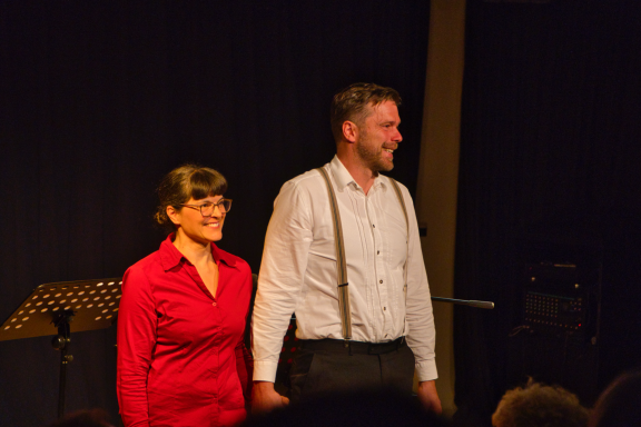 Patricia Menzel und Manfred Selb arbeiten sich durch Vorlesepassagen in Hochdeutsch, verfallen in vielen Dialogen in wilde Dialekte, um dann gemeinsam Schlager aus den 60igern zu trällern.