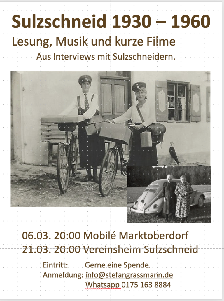 Im Mittelpunkt des Abends stehen Geschichten von Marie Luise Hipp (Jahrgang 1935) und Armin Klaus (Jahrgang 1940), die in Sulzschneid geboren wurden. Außerdem hat auch Joseph Pröll (Jahrgang 1937) der als Vertriebener mit 6 Jahren hier angekommen ist, spannendes zu berichten. Die „gute alte Zeit“ hat jeder von den Dreien anders erlebt und das macht den Abend spannend, lustig und sehr informativ. Interviewt wurden die Drei 2020 von Stefan Grassmann.