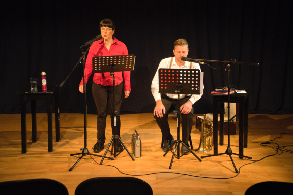 Patricia Menzel und Manfred Selb arbeiten sich durch Vorlesepassagen in Hochdeutsch, verfallen in vielen Dialogen in wilde Dialekte, um dann gemeinsam Schlager aus den 60igern zu trällern.